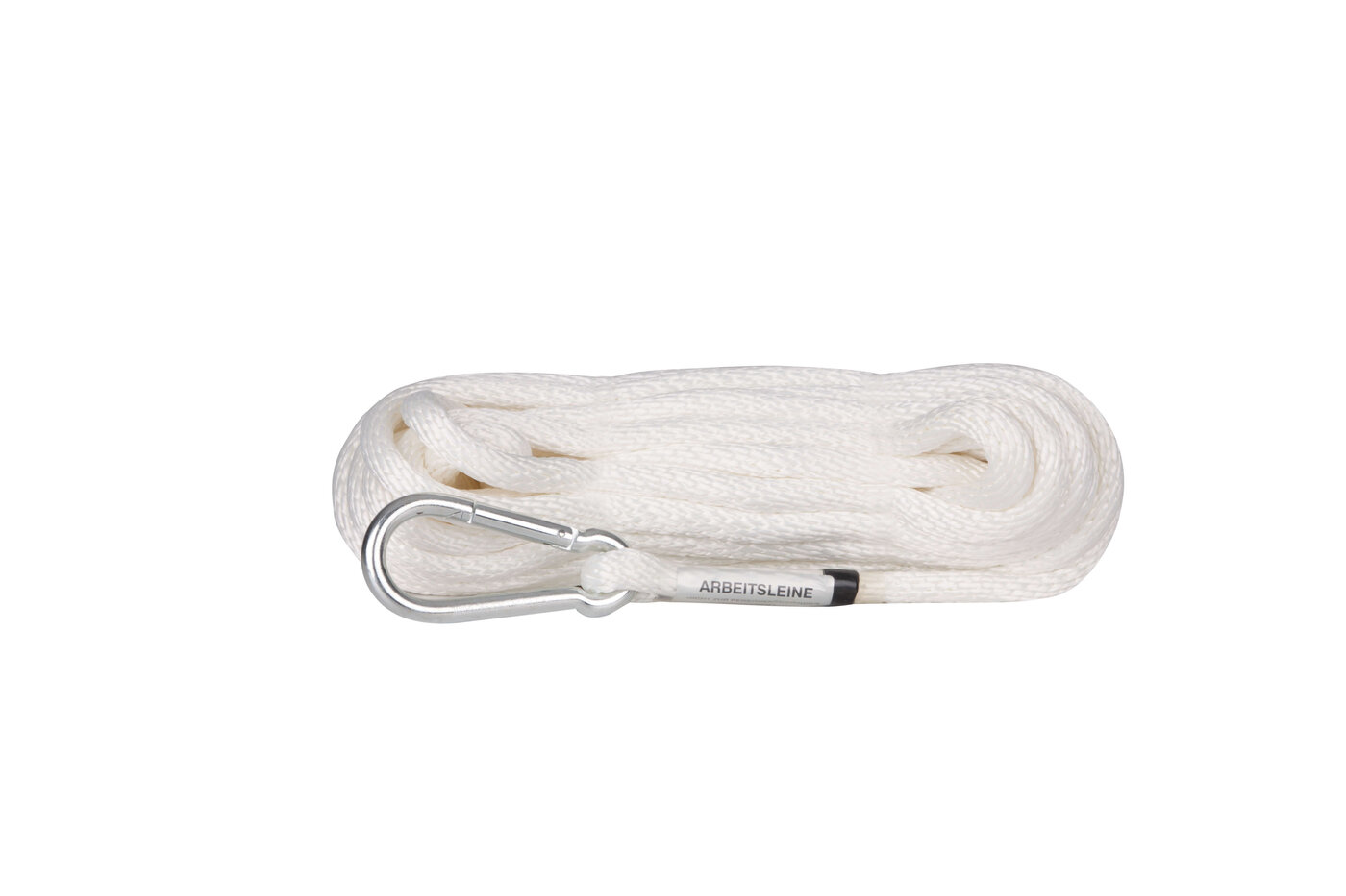 Arbeitsleine aus Polyester, spiralgeflochten, ein Ende mit Stahl-Birnenkarabiner, anderes Ende stumpf abgeschmolzen.