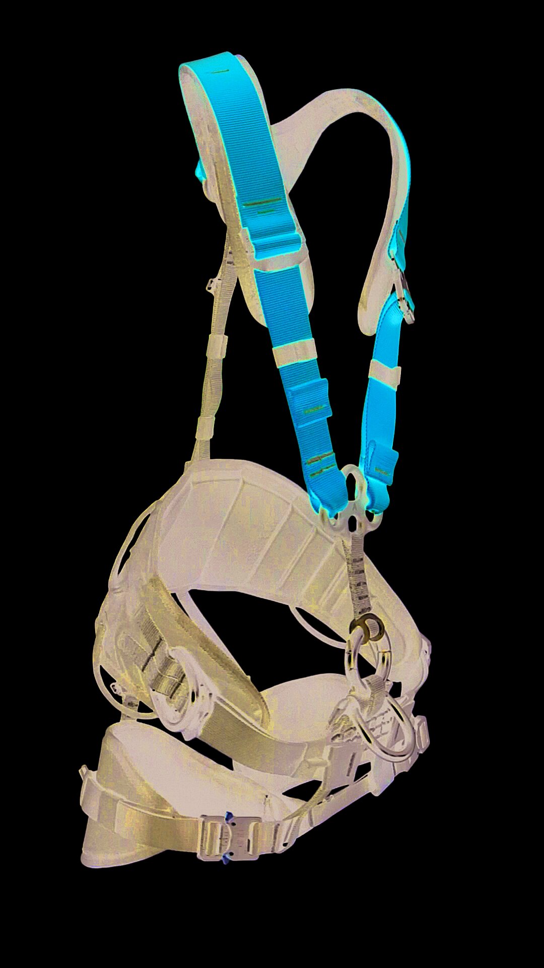 Die zwei textilen Schlaufen neben der ventralen Abseilöse bieten Platz zum Einhängen von Sitzbrettern.
