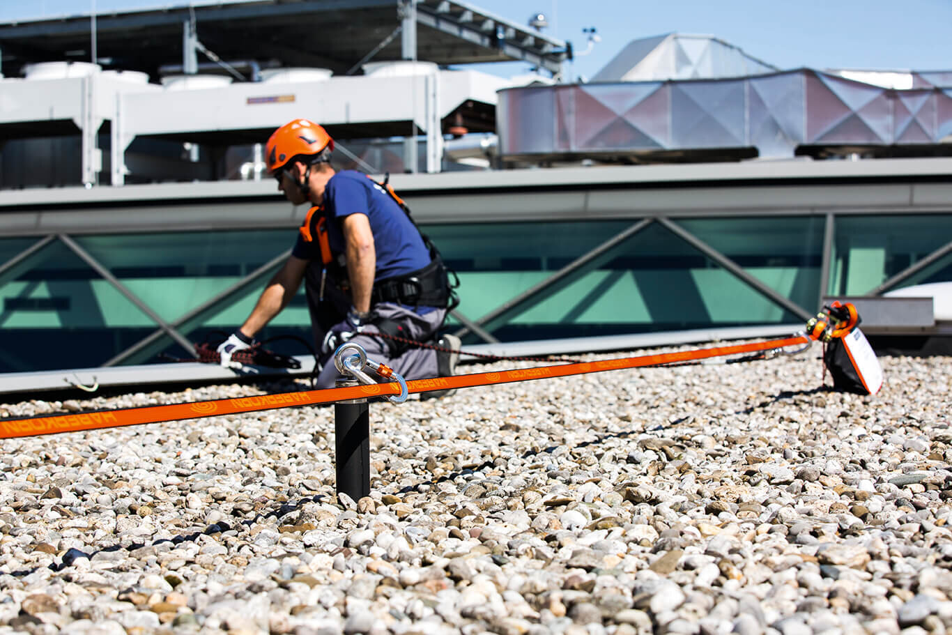 Die horizontale mobile Absturzsicherung aus PE Gurtband ist besonders widerstandsfähig und kann durch die integrierte Ratsche optimal vorgespannt werden.