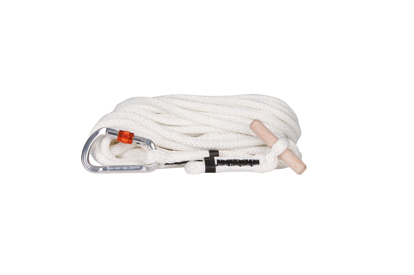 Steigerleine aus Polyester, spiralgeflochten, ein Ende mit Holzknebel, anderes Ende mit Leichtmetall- Karabiner.