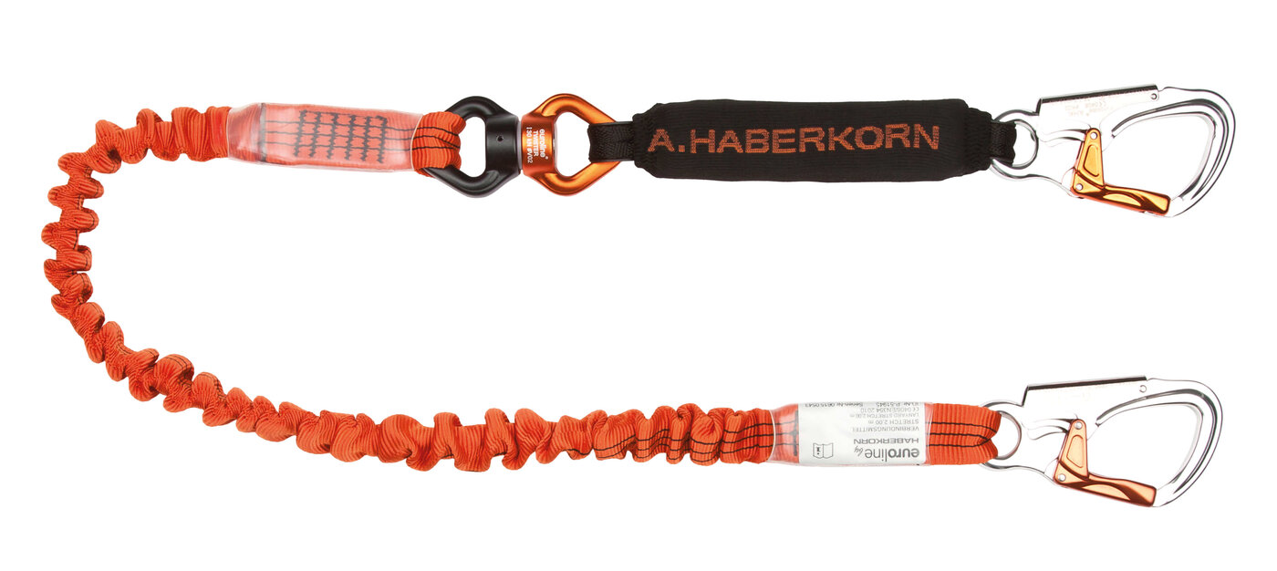 - Unteres Ende: AHK Einhandkarabiner, Drehwirbel SWIVEL, Bandfalldämpfer ARRESTER mit abnehmbarer textiler Hülle