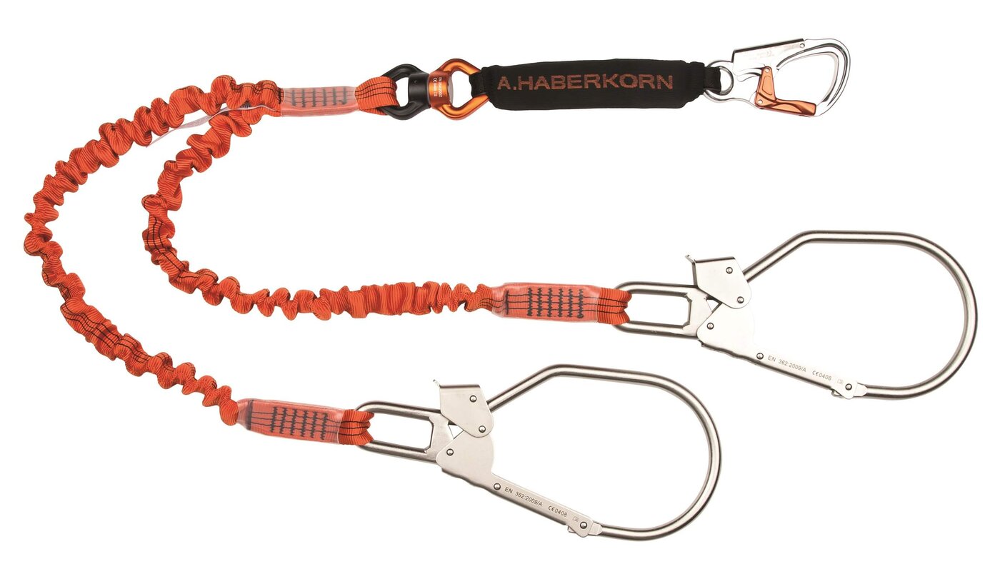 - Unteres Ende: AHK-Einhandkarabiner, Drehwirbel SWIVEL, Bandfalldämpfer ARRESTER mit abnehmbarer textiler Hülle